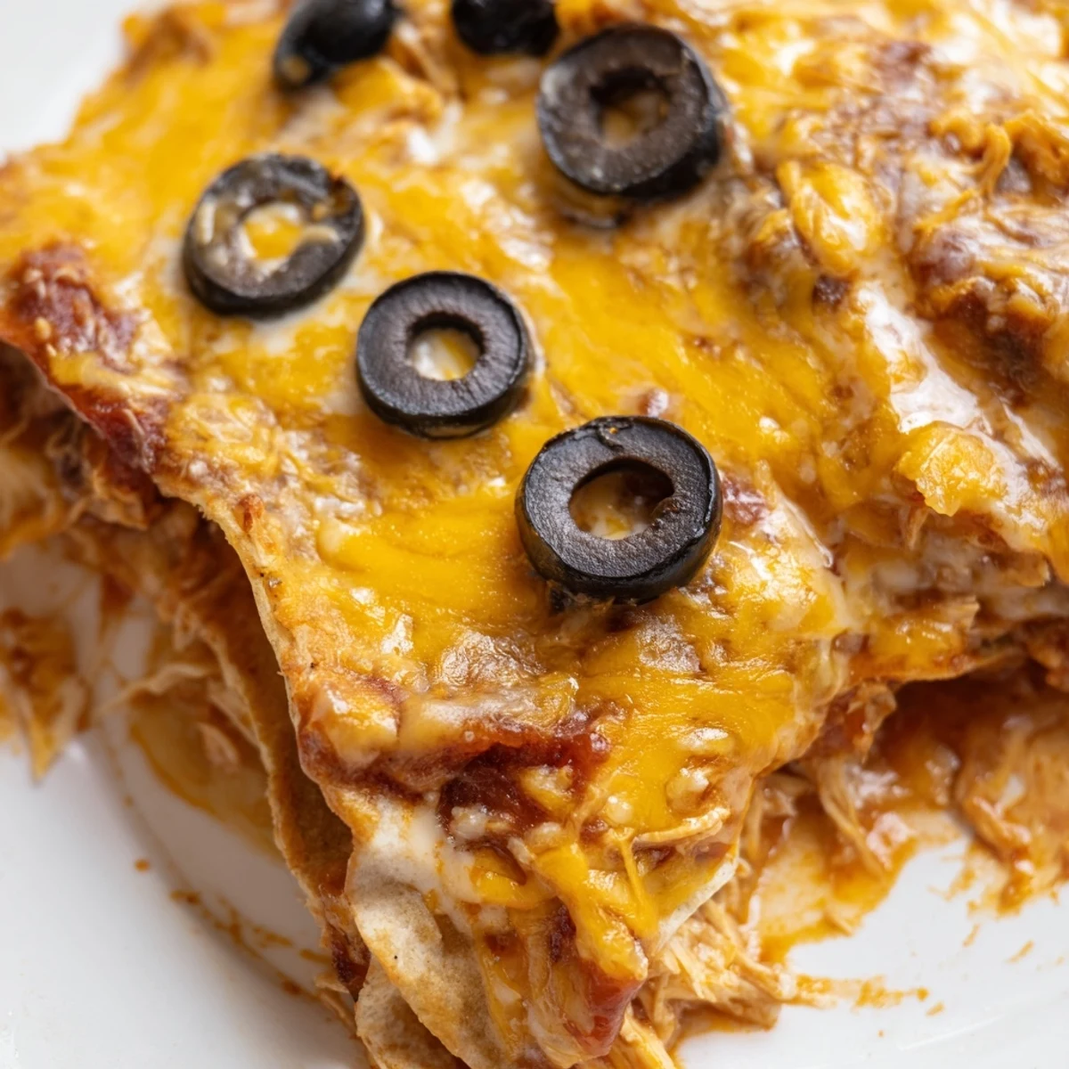 - Place the final tortillas over the top, pour the remaining 1/2 cup sauce evenly over the surface, and top with the remaining cheese and olives if using. Make sure the sauce covers the tortillas so they do not dry out.