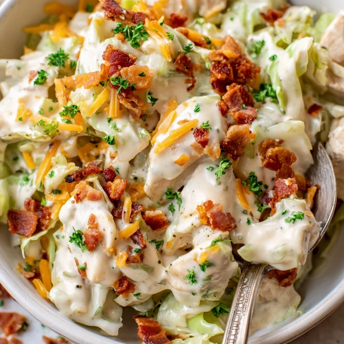 This hearty bowl brings together tender bite-sized chicken, crispy bacon, and thinly sliced green cabbage all coated in a luscious homemade ranch cream sauce. The combination of heavy cream, sour cream, and cream cheese creates an incredibly rich and velvety coating that clings perfectly to every ingredient.
