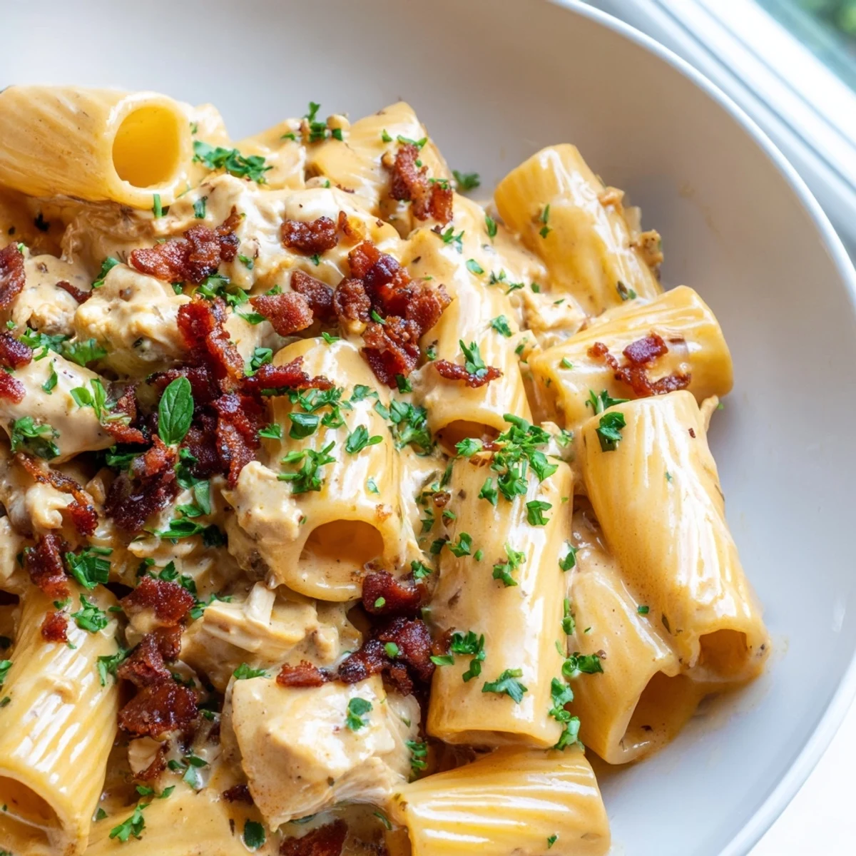 The combination of cream cheese, sharp cheddar, and heavy cream creates an incredibly rich sauce base. Seasoning the chicken with smoked paprika, garlic powder, and onion powder adds layers of savory depth, while crispy beef bacon contributes smoky crunch throughout the dish.