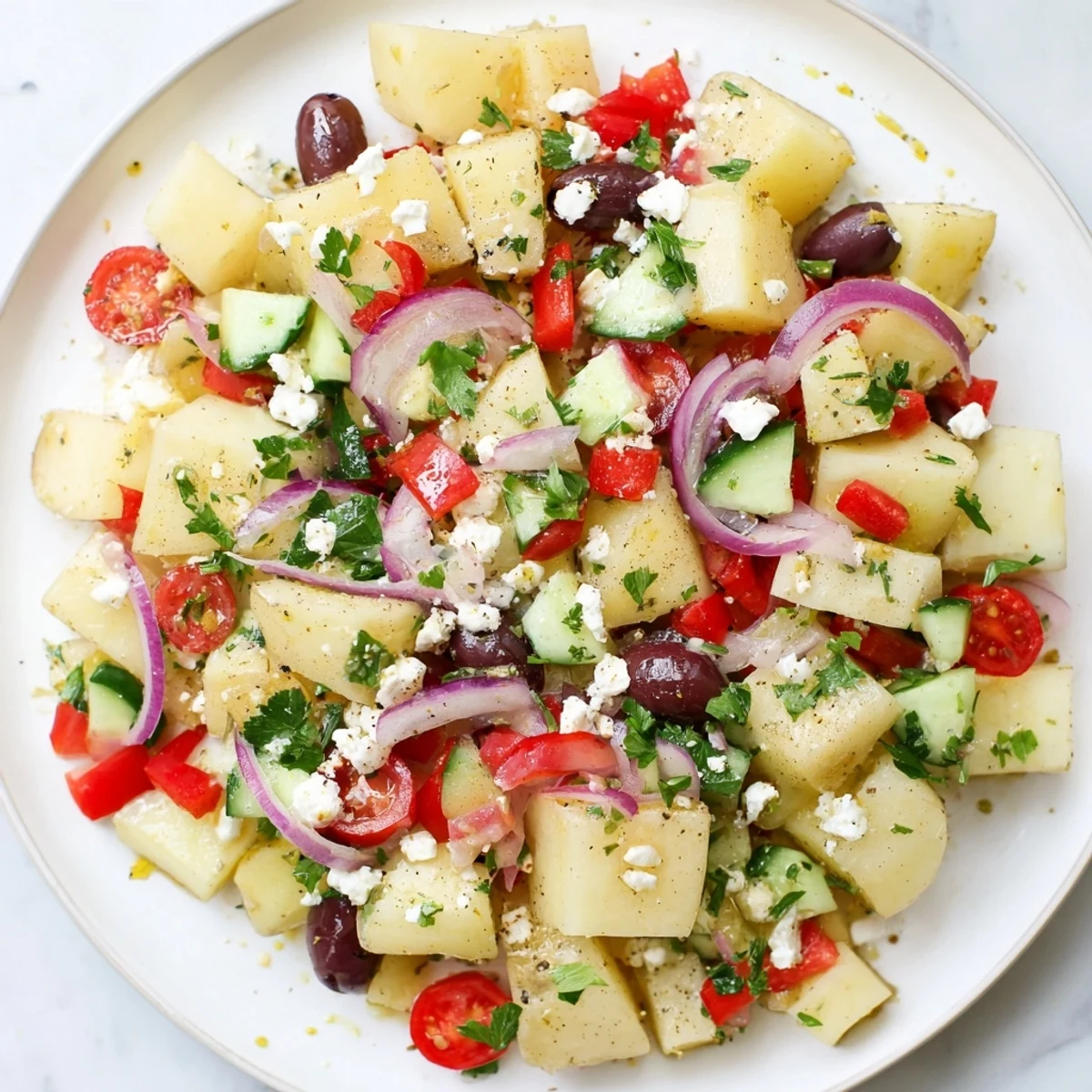 - Toss the warm potatoes with the red onion, cucumber, bell pepper, cherry tomatoes, olives, and parsley in a large mixing bowl.
