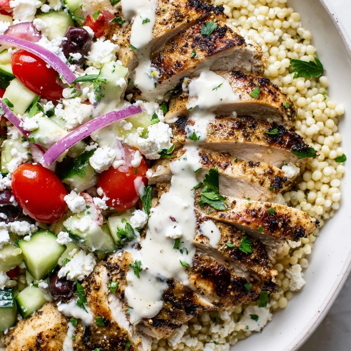 This wholesome Mediterranean bowl combines juicy chicken breasts seasoned with aromatic cumin, smoked paprika, and oregano, then grilled to golden perfection. The chicken rests atop a bed of light, fluffy couscous, surrounded by crisp cucumbers, sweet cherry tomatoes, tangy Kalamata olives, and peppery arugula. A velvety lemon-tahini sauce ties everything together with its rich, nutty flavor and bright citrus notes.