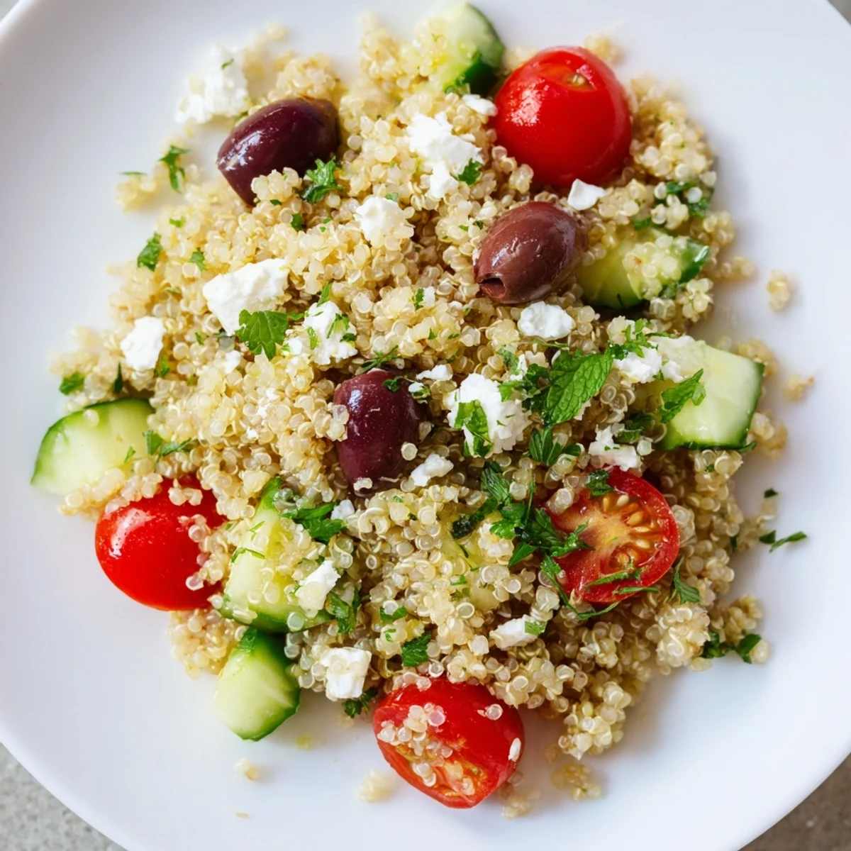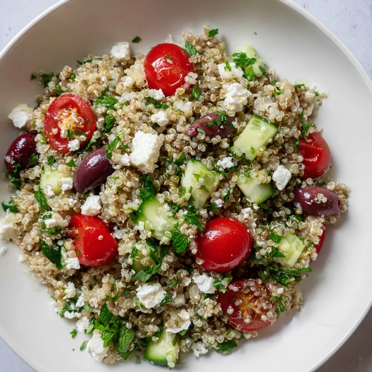 I discovered Mediterranean Quinoa Salad during a sweltering July afternoon when my kitchen was too hot for proper cooking but my stomach demanded something substantial. The vibrant colors caught my eye first - the ruby reds of tomatoes, purple olives, and specks of green herbs against the canvas of fluffy quinoa. The way the feta slowly melted into the still-warm grains created this magical moment where the entire kitchen filled with the scent of lemon and herbs.