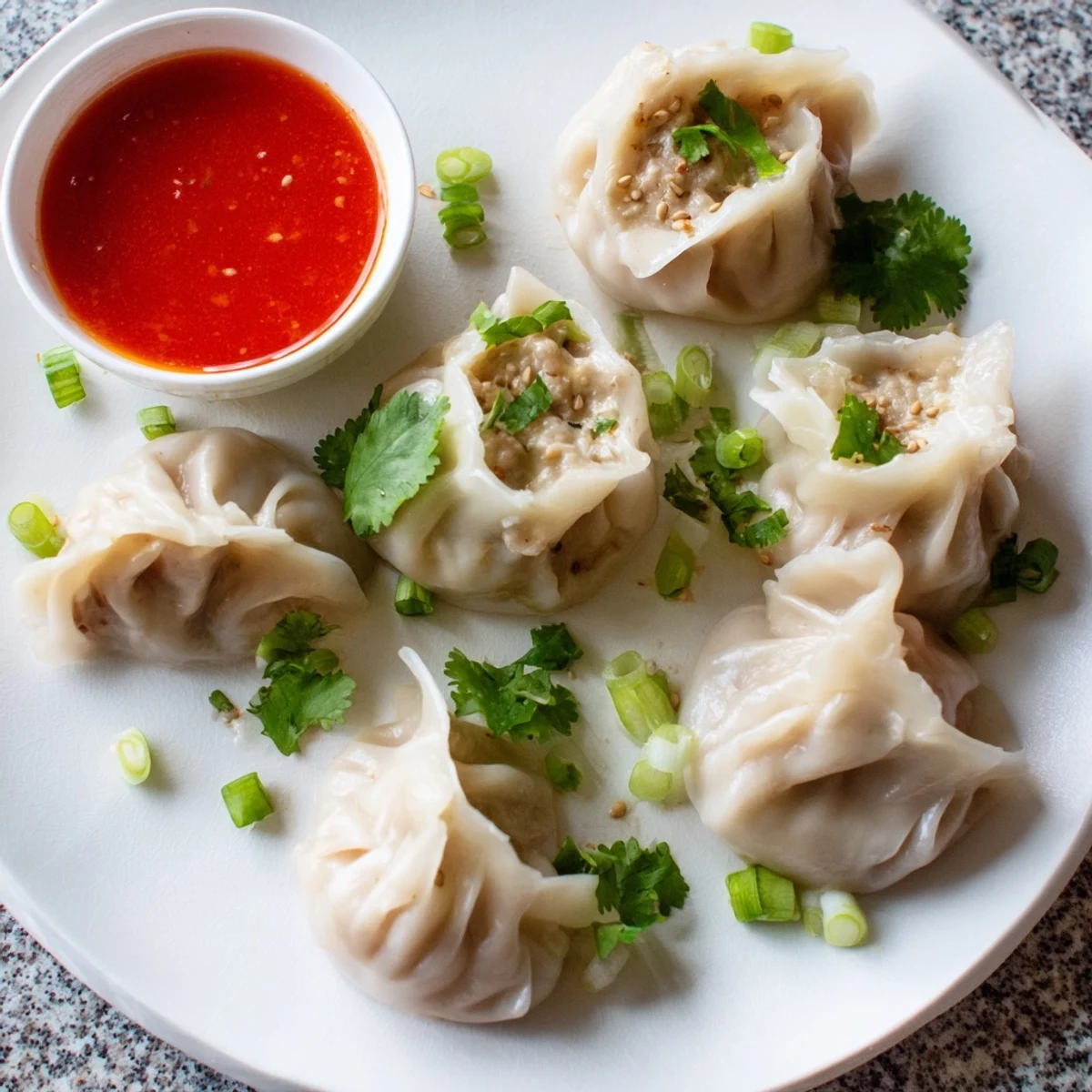 These Nepali momos feature tender handmade wrappers encasing a savory filling of spiced meat or vegetables. The dumplings are traditionally steamed, creating that characteristic soft texture while keeping the filling juicy and flavorful. Perfect pleating technique seals in the juices, while the accompanying spicy tomato-based dipping sauce adds the perfect balance of heat and tang.