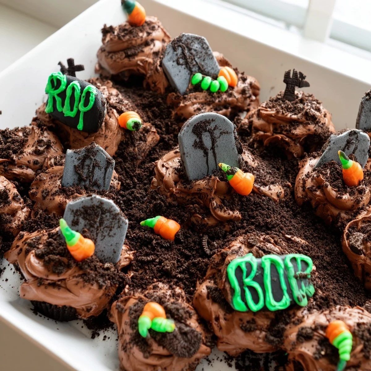 - Crush chocolate cookies and sprinkle over the frosting. Write RIP or spooky messages on rectangular cookies and press them into the cupcakes as tombstones.